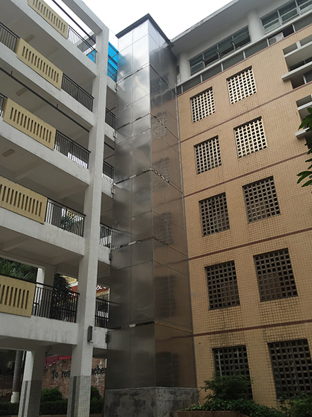 學校加裝鋼結構電梯井道,選用50年不生銹鍍鋅鋼材、高質量特種玻璃,耗時三周期竣工。
