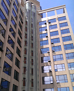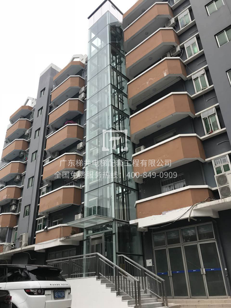 大廈加裝鋼結構電梯井道,選用50年不生銹鍍鋅鋼材、高質量特種玻璃,耗時三周期竣工。